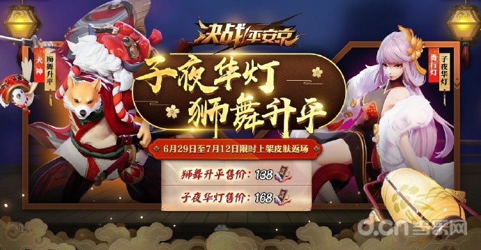华美的庆典上,幸运达摩也将降福平安京。6月29日至7月12日期间,大人们们可通过购买半年庆礼包或完成任务获得半年庆纪念章,半年庆纪念章可以兑换吉庆达摩,玩家们可用吉庆达摩抽取海量永久皮肤、皮肤试用券、半年庆纪念币等奖励!而半年庆则可用于兑换珍贵的典藏皮肤,青行灯子夜华灯典藏版:魅影华灯、犬神狮舞升平典藏版:云帆升平、金鱼姬金弥纸偶典藏版:和果纸偶,以及觉醒幻化符等珍贵道具哦!