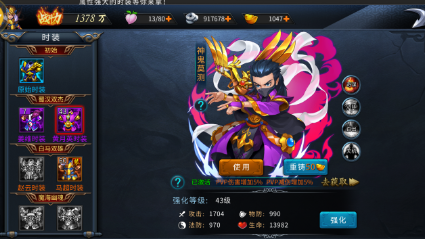 《扫荡三国》的特色系统之一“时装系统”。时装不仅给人新的一个面貌,同时还有技能伤害和PVP增伤和减伤加成。