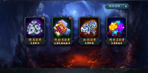 每周一三五开放银两和经验书副本,每周二四六开放秘钱和精炼石副本,每周日开放所有的副本。