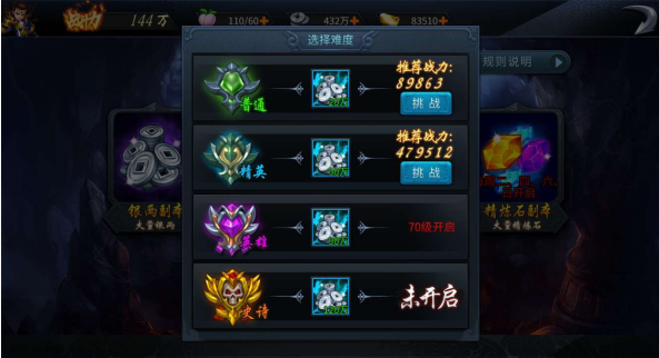 每个副本暂分为4个级别,按角色等级解锁对应副本级别。每个副本每天只可选择一个难度挑战一次噢!