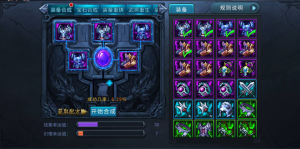 3、合成紫色以上装备失败会累积幸运值,幸运值满后下次合成100%成功。