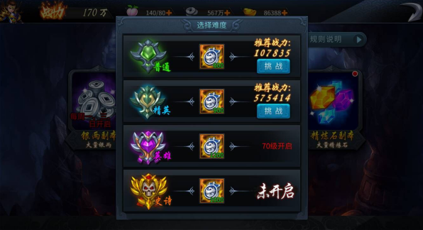 每个副本分为4个级别,按角色等级解锁对应副本级别。