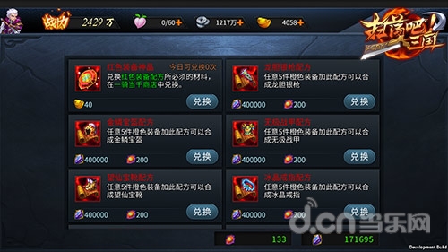 不难想象,拥有如此盖世威力的绝世红装,其打造条件自然也会相当苛刻。在《扫荡三国》当中,合成系统为主公们获取绝世红装的主要途径。而主公们需要提供相应部位的红色装备配方以及5件橙装作为原料,才能够有100%的成功率合成得到绝世红装。