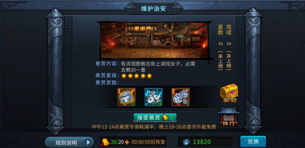 人物角色20级以后自动开启悬赏任务,分为2、3、4、5四个星级品质,完成任务后可获得经验、金币、专属代币奖励,有几率额外获得元宝和随机装备奖励。