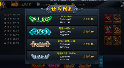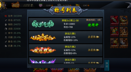 称号在每个区服只有200个,只有通过每周的跨服3V3,排名前200名才可以获得。称号的装备可以提升生命和攻击,前3名获得称号可以增加全属性和伤害增加。称号有限7天,刚好是跨服3V3的一个周期。装备了称号,在各种战斗中,人物的头顶都会显示称号。所以,提高你的战斗力,去获得称号吧!