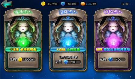 神秘占卜也是需要花费钻石抽取,每次抽取可获得当天指定英雄或灵魂石。