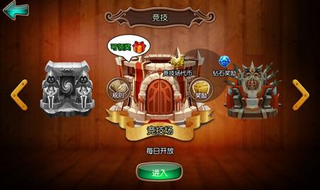 竞技场以排名的形式在服务器内部进行,15级开放。挑战排名在你之前面的玩家,获胜了则排名互换,失败则排名不变。首次达到历史最高排名会有一次性大量的钻石奖励。排名奖励每天发放一次,以晚上9点的排名为准。每天可以战斗5次,每次战斗间隔为10分钟,每次获胜可获得2积分,失败获得1积分,可用积分兑换竞技场积分奖励。