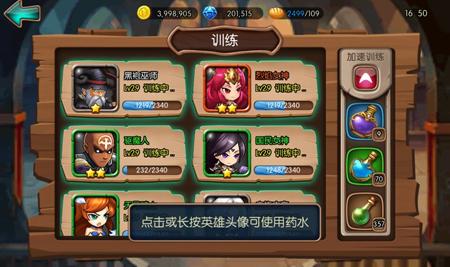 【训练】训练是快速对女神和英雄进行升级的场所。玩家可以将女神和英雄放置训练位上自行升级,也可利用训练药水对女神和英雄进行快速手动升级,大大缩减培养女神和英雄的时间,快速提升战队实力。训练药水可通过占卜抽卡大量获得。