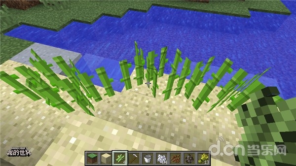甘蔗的高度是3格或更高,会生成在水边的沙地上,