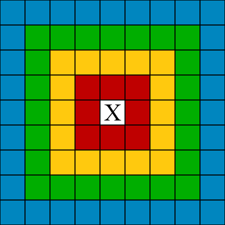 以下是一幅显示爬行者爆炸伤害可能性的图片。中央有着“X”的白色区域是爬行者的位置。这个网格以方块代表距离,并表示出了玩家身处每一格的危险性。请注意,你可能认为自己离它有2个方块,但实际上这个距离会更近。这与你的显卡和视角(比如仰视和平视)有关。