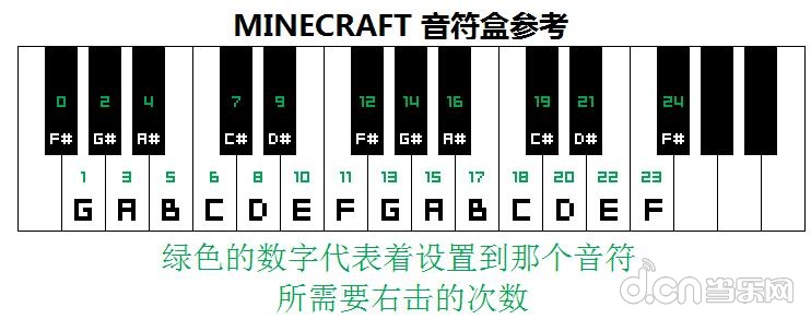 每次右击音符盒都会让其下一个发出音符的音高提高半阶,至多可以提高两个八度(从 F#3 到 F#5)在提高至 F#5 后下一个触发音符盒会复位至发出 F#3 的状态,依次循环,破坏音符盒再摆放也会重置音高。下述具体的音高列表。