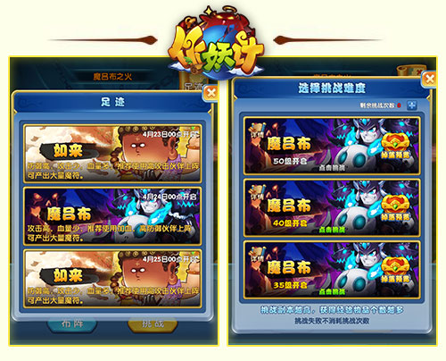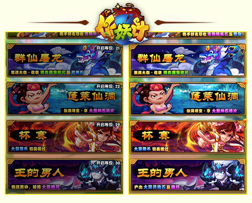 在《作妖计》众多的日常玩法中,玩家可通过“竞技场”名扬天下,通过“群仙屠龙”中屠龙斩凤得魔宠碎片,更有“夺宝”、“好友副本”、“蓬莱仙洞”等玩法可获得稀有资源。而在“王的男人”玩法中,三界最强BOSS如来、吕布现身,玩家通过挑战,在获取资源的同时,更可检验自己的实力。