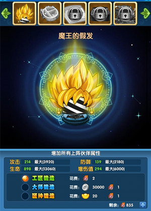 法宝系统是《作妖计》本次更新才加入的玩法,这是一个能给全部上阵伙伴带来属性加成的系统,经过小编试玩,虽然略氪金,但带来的增益十分显著,算是性价比高的良心系统。当然,法宝系统的核心乐趣仍然是……脑洞。且看这第一件解锁的这件法宝,名为“魔王的假发”……这什么假发啊!这明明是超级赛亚人啊!还是合体版的啊!界王神的耳环都还在啊!闹哪样啊!