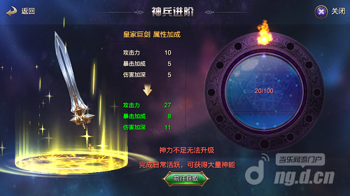 神兵是《永恒领主》中的重要系统。相当于武器的培养,通过提升活跃度可以获得大量的神器能量,用来升级神兵,提升神兵等级。当神兵到一定等级之后可以突破,武器外形也会改变,增加武器的光效。