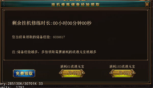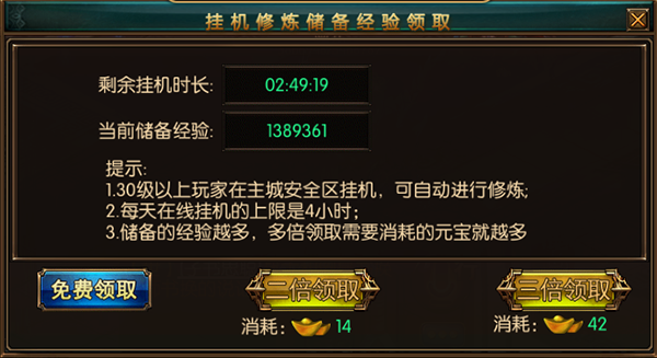 挂机修炼经验可以到挂机修炼NPC储备处领取分别是免费领取当前挂机的经验、花费元宝2倍领取、花费元宝3倍领取,经验越多需求元宝越多。