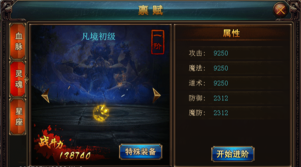 4:灵魂进阶可提升攻击、魔法、道术、防御、魔防的属性。