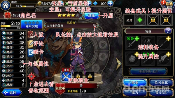 能力设置:配置能力,每个英灵可以配置【当前职业主技能(主动)】【英灵已解锁基本技能(主动)】【反应技能(紫技,被动)】各一个,【支援技能(绿技,被动)】两个。