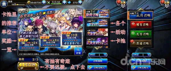 普通召唤:每日5次免费单抽,也可以消耗90000金币进行一次十连抽卡,卡池内容较为杂乱,多为装备品和极少英灵碎片。