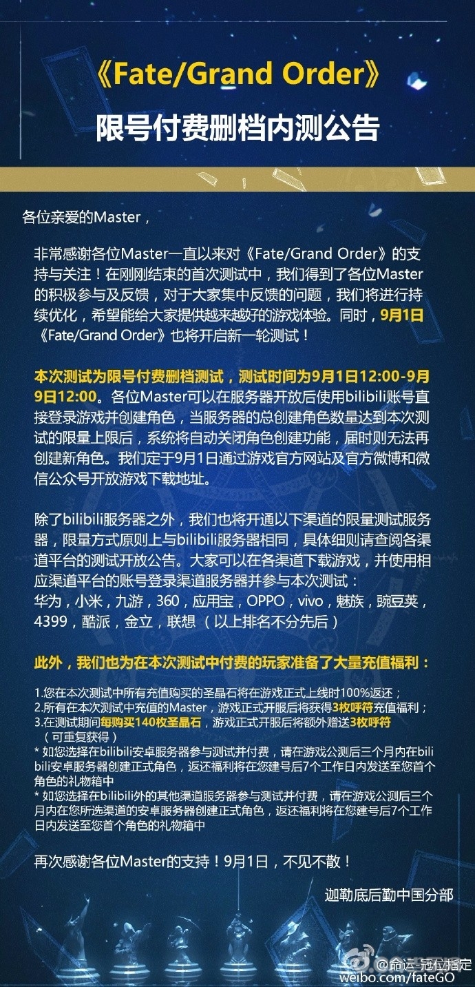 FGO《命运-冠位指定》限号付费删档测试将于9月1日开启!