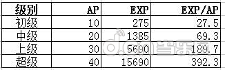 从体力和经验比可以看出,超极本(40AP)绝对是超值的副本,能让玩家快速升级。推荐玩家在收集到魔力棱镜之后,可以将所有的体力都用去刷40AP的狗粮本,这样在前中期快速提升玩家等级。在20-30的玩家,差不多2波超级经验本就可以升一级。