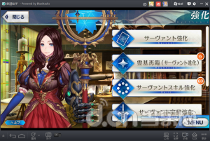 对玩家持有的从者与礼装进行强化的界面,包括从者的等级提升、双围强化、技能强化、宝具强化、灵基再临(从者进化)与概念礼装的强化等等。
