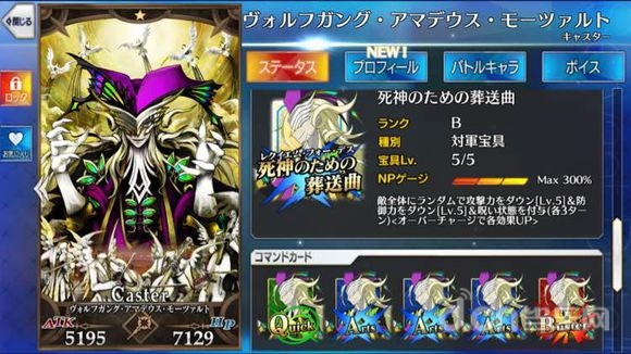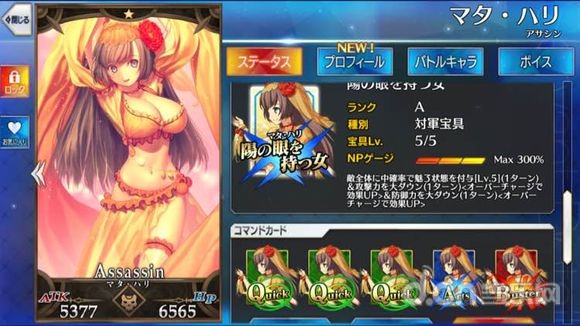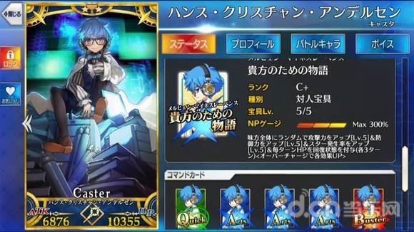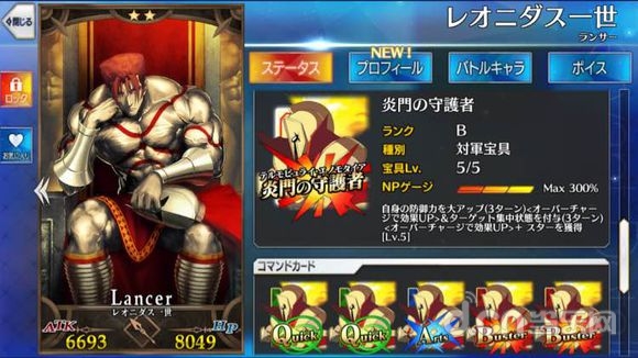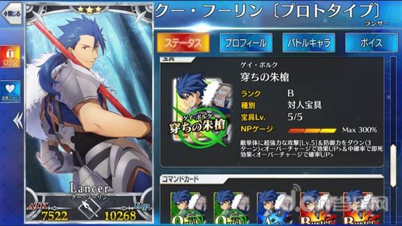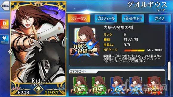 宝具:概率赋予己方全体攻击上升+防御上升+掉星率上升(三回合)+hp自动回复(三回合)