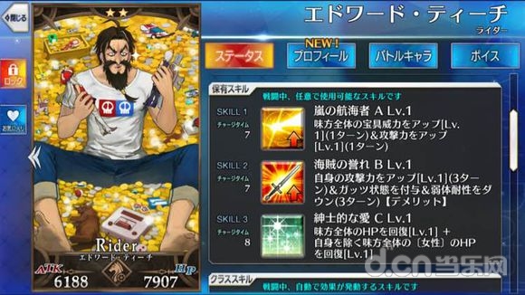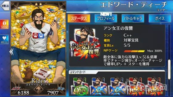 基本思路:光炮平均型从者,一技能能够给全队带来输出能力的增幅。二技能则是目前游戏中唯一一个不受回合限制,直到hp归零才会触发的站续技能也保证了黑胡子的生存能力。三技能则是可以给己方全体带来回复,女性则是可以获得更多的回复,有效地保证了队友的生存。其宝具是非金卡从者中少见的骑阶红卡光炮输出宝具,加上两红配卡,在输出方面也能得到保证,在低星从者中属于很实用的类型。