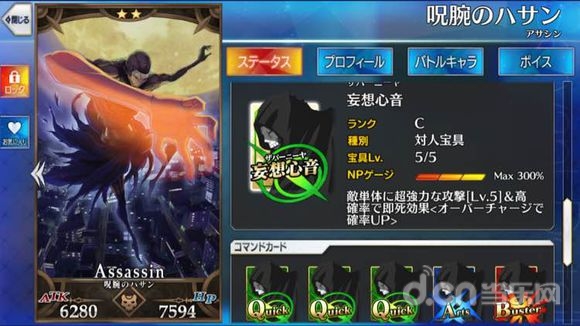 宝具:对敌单体造成高伤害+中概率即死+敌防御力下降(三回合)