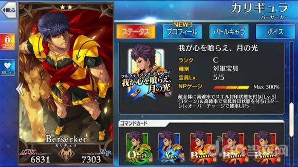 基本思路:输出型从者,因为三张红卡的优势以及技能对自身攻击防御力带来的增幅,普通攻击的情况下可以打出优秀的输出伤害。宝具可以用来控制对方,以防止对方的宝具和技能对己方造成威胁,但由于np获取率的缺乏,所以总体来说,缺乏np礼装情况下的卡里古拉的使用一般会放弃控制系宝具的使用,以普通攻击的输出作为重点。