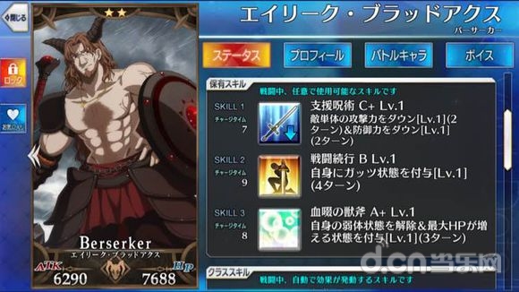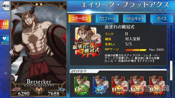 2.战术特化型从者,所谓的战略性核弹。一释放宝具为目标而积攒np,用于对付敌方的boss和快速清除杂兵。如果达到五宝具等级的话,即使是在游戏后期也能造成不弱的伤害,但由于埃里克受制于狂战士阶职的特点,所以想要释放宝具必须要有礼装的支援,并且在释放宝具完失去价值后也不会立刻退场,使得其实用度相较一星的阿拉什要略逊一筹。