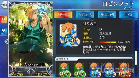 总结定位:宝具输出型从者,自身拥有伤害强大的宝具,但常规作战能力较弱。一般是以释放宝具为目标而积攒np作为主要战术。在大部分的战斗中,通常只会释放一次宝具足矣。但是面临血量极高的boss或小怪需要多次释放时,则可以放置在蓝卡队中来带动np的获取。罗宾汉通常适于针对剑士阶和狂战士阶的敌人时使用,即使在游戏后期也能作为强力的对boss用输出,新手玩家可以将其列为着重培养对象。