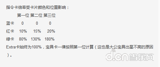首卡加成:绿卡打头为20%,红蓝卡打头为0。游戏中选择率卡第一位时,其他的指令卡都会出现一圈绿色的光晕,就是在提示首卡加成。对于宝具卡,首卡加成一律为0。