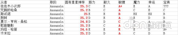 从者职阶决定了从者的固有星星掉率,其关系为:Assassin(25%)>>Lancer(12%)>Caster(11%)>Saber(10%)>Rider(9%)>Archer(8%)>Berserker(5%)