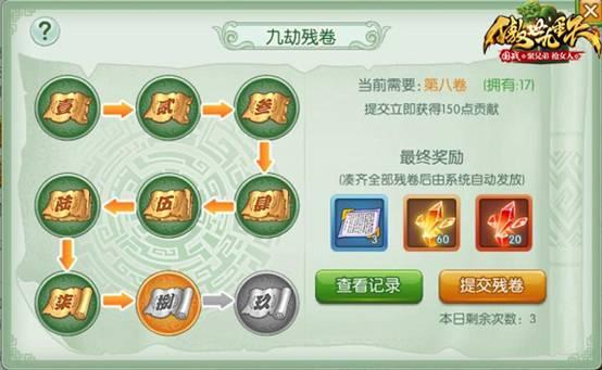 神功随着神功等级的提高,附加属性带来的战力提升也是非常惊人的。神功的升级需要消耗神功残卷,不同阶段的神功消耗的神功残卷种类也是不同的,初期的神功消耗的是初阶残卷。那么我们如何获得神功残卷呢?神功残卷主要产出于家族的九劫残卷活动中。在家族的九劫残卷活动中,家族成员可以提交相对应的残卷,当凑齐壹到玖卷残卷,系统会自动发放神功残卷、史诗万能碎片和传说万能碎片。