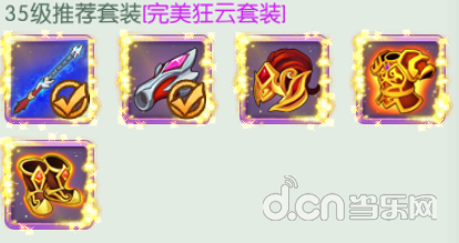 在游戏中有套装装备,套装装备可根据穿戴的部位数量获得套装属性加成。在游戏前期主要推荐35级的完美狂云套装,可通过“装备跑环”任务得到大量的装备资源,再他们全部通过合成为橙色品质。