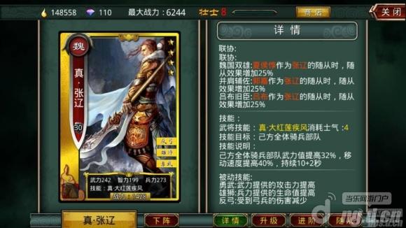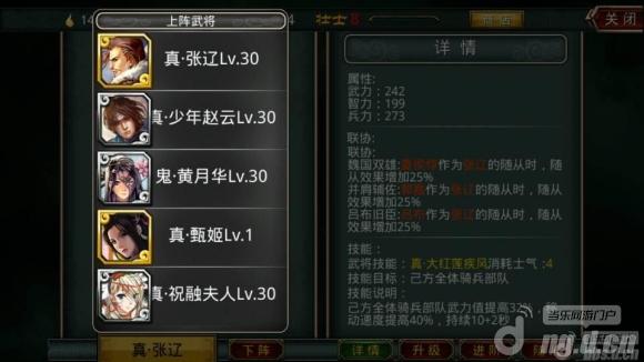 单独的骑兵放在这里感觉很是无语,但没有办法,没遇到好的骑兵,张辽留着他就是为了弄个4骑1弓的队伍,不为别的就是他的技能加全体的。