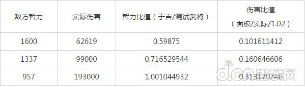 以目前比较风骚的于吉为例,958的智力面板伤害是60多万。对不同智力的3个武将炸了3次,获得三组数据,由于游戏中的伤害计算都以智力比值有关,再考虑到鬼谋2%的伤害加成,最终我们可以得到如下的结果: