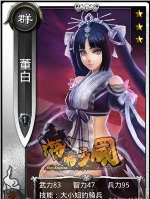 啪啪三国董白是游戏中的一张银卡骑兵女将,很多玩家在组建骑兵阵容的时候都会选择她。下面小编为大家带来的就是关于她的相关资料解析。