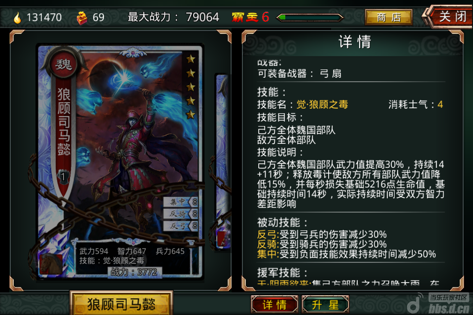 来看看狼顾:4气,魏国武力30提升,持续28秒,毒计使对面降武15%,5216秒伤,持续14秒,实际持续时间受双方智力影响。