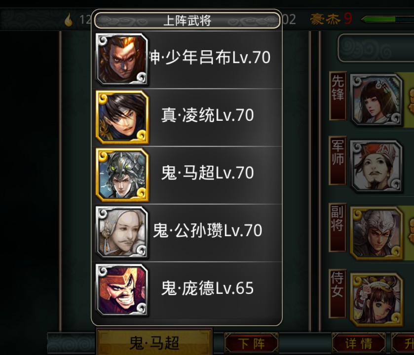 如图,我的阵容,杂牌五骑军,没核心卡,不过马超进鬼,吕布进神,前中期还能玩玩,打竞技场,一般同战力的,很少输。不过那天我却输得惨啊,我记得对面是核心鬼诸葛+神王异辅助,我忘了有没有小乔了,不过没看见小乔出手,估计是没有小乔吧。战力差距我方20000VS对方13000+。我看有诸葛,就采取三骑正面佯攻,主力马超带庞德侧翼迂回突击诸葛,运气挺好,对面阵容是从中间团体前推,这样对于我的阵容来说占据阵容优势,马超可以不受影响直接切后排。