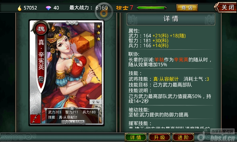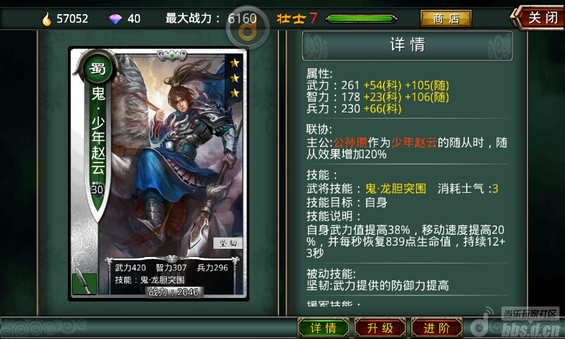 壮士7的少年赵云的武力提升到1954,完全没有用任何援军。哇塞!秒杀的节奏呀!哈哈……一个字“爽”,两个字“超爽”,三个字“帅呆了”还有,赵云的自身加血的多少好像与自身的智力高低有关,智力越高,自身回血就多。就拿我这个少年鬼赵云来说,下图