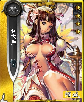 很多小伙伴是不是会觉得奇怪何太后又不强力,也没有什么核心武将的联协,但是何太后是非常非常值得收藏的一张女将卡,因为她……原因你懂的!试想一个屠户出生的女人,会得到当今皇上的爱慕,可见其容貌在三国中也是数一数二的人呀。