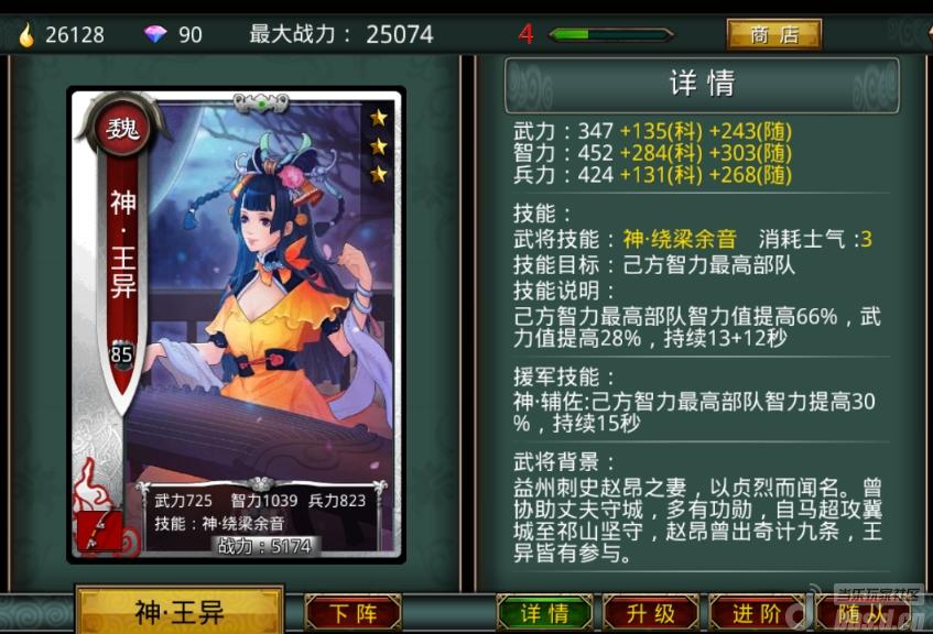 对于猪哥的“小妾”,王异小乔,前中期二选一,平民我推荐王异,神王异是加66%智力,而鬼小乔是加68%,效果相差2%花销却相差很大,前中期我推荐单buff猪哥,不推荐双buff,具体情况,玩过的应该懂,前中期,buff存在时间短,双buff坚持不了放俩雷,我单buff猪哥竞技场遇到的同智力双buff猪哥,20000战力以下时,真心没输过,感觉比对阵单buff猪哥要轻松得多,土豪可以无视。随着战力的提升,辅助智力也将渐渐提升,即buff存在的时间也会增长,就可以考虑换双buff王异+小乔同时上阵了。