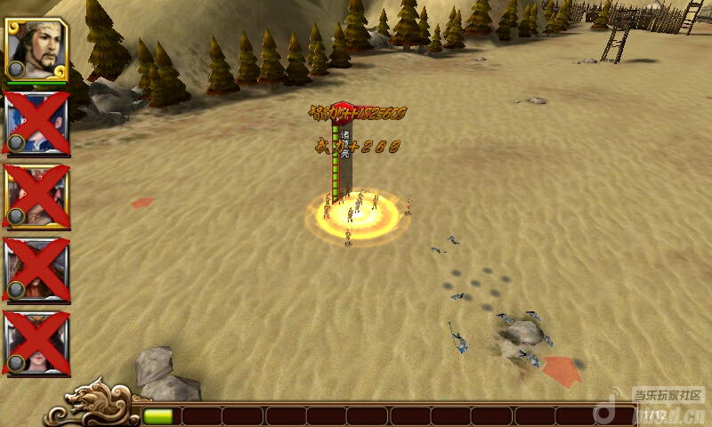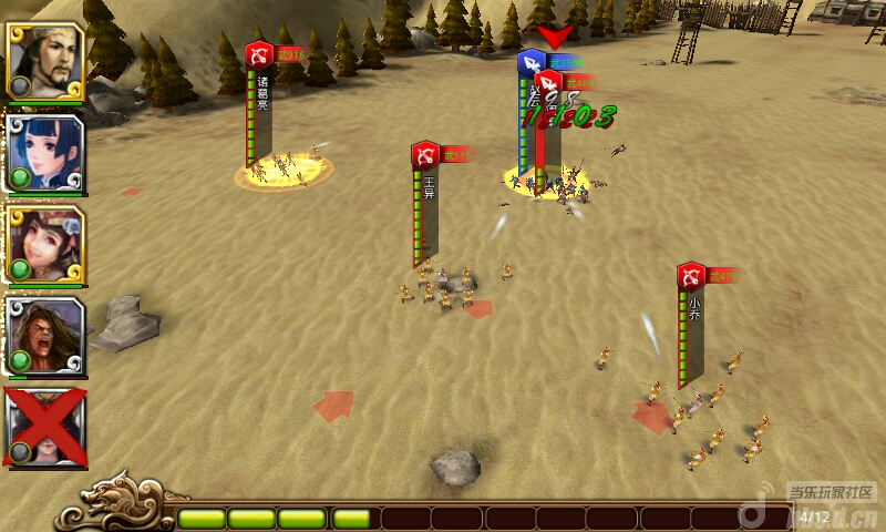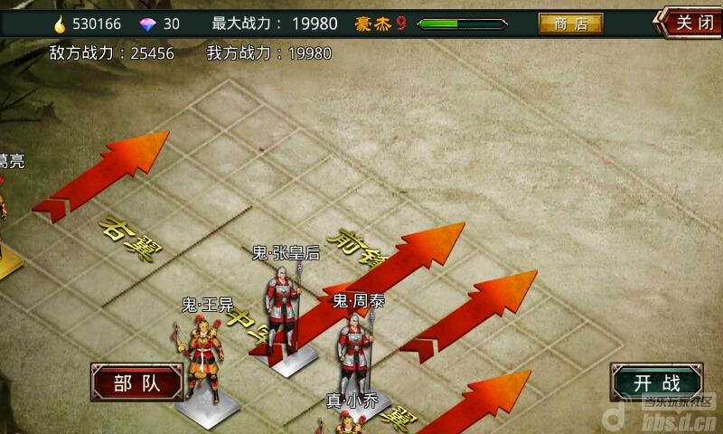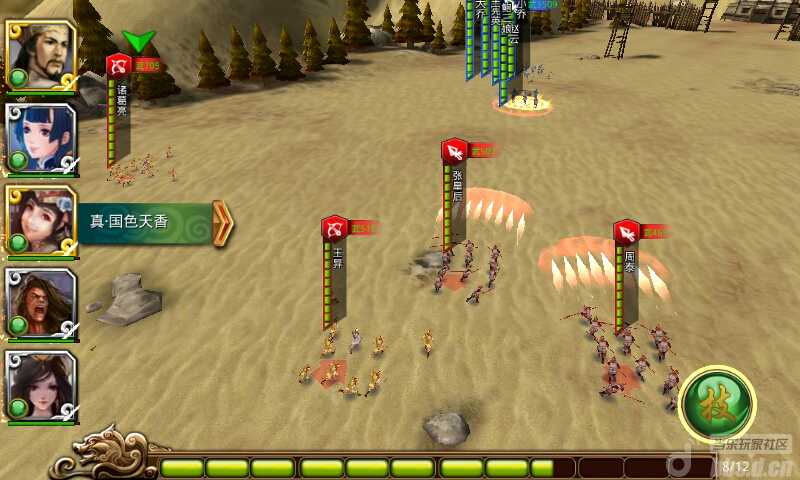 我方战力20000左右,敌方战力25000 如果是以前,我遇上这难缠的【赵云后宫队】就点退出战场了。可是现在我不怕了,有方法灭了他,嘿嘿…… 我以前的打法是等够了12士气后才开王异+小乔+诸葛亮。这样的打法根本打不死赵云的,因为等我够12气后,赵云也吸收了后宫队的功力,智力大增。要赢他唯一的方法就是要先灭了赵云的四个后宫!如下图: