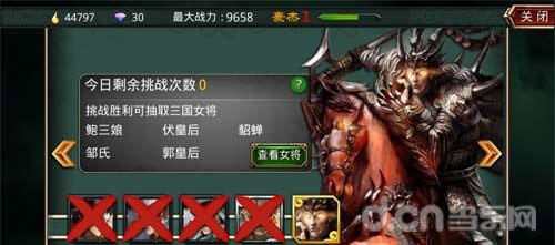 女将:挑战关卡的界面上可以清楚的看到每个关卡产出的女将列表,点击“查看女将”按钮后,还可以看到相应的女将卡片和其战力。