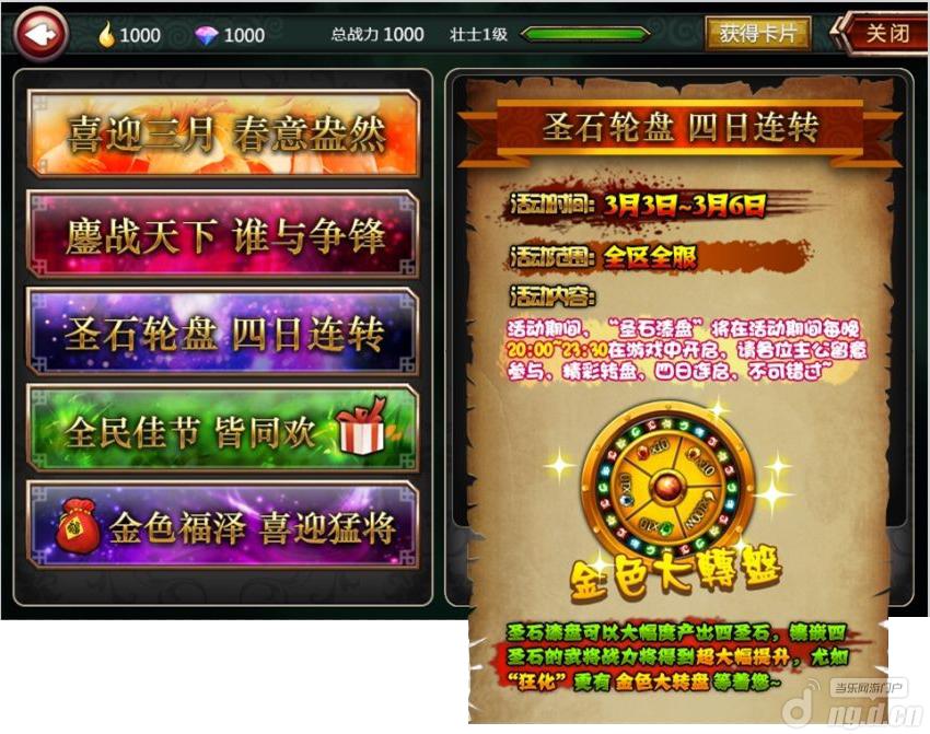 活动内容:活动期间,“圣石漆盘”将在活动期间每晚20:00~23:30在游戏中开启,请各位主公留意参与,精彩转盘,四日连启,不可错过!