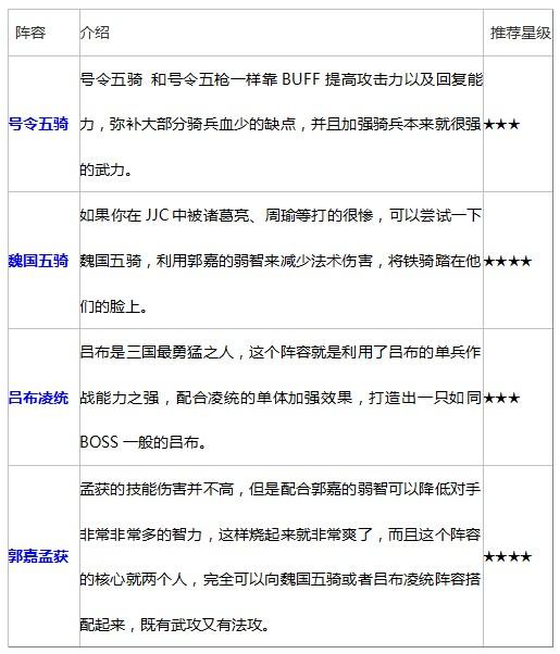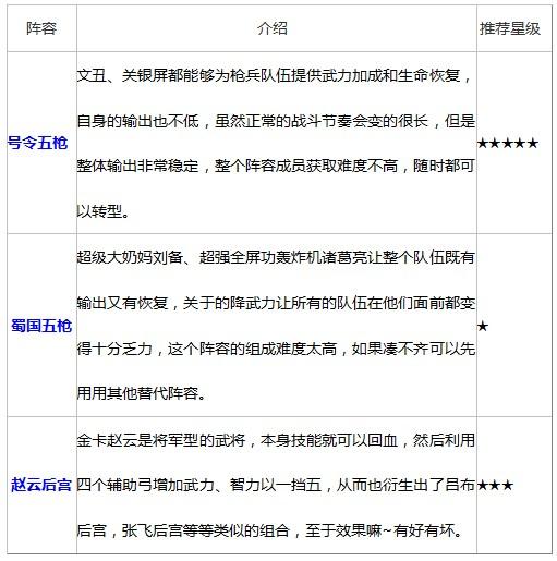 首先是关于枪兵的阵容,枪兵行军速度慢,但是有很多兵力成长超高的枪兵,可以配合号令进行回血或者是挡在前排为释放技能需要大量士气值的弓兵准备爆发的时间。