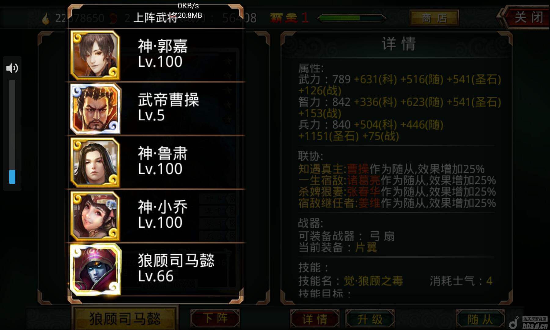 4、尽早做出一个神100的张春华给司马军师随从。即便前期狗屎运抽到了诸葛,如果你没有充足的资源升神诸葛,还是不要用它来做随从。神张春华比鬼诸葛的效果要好。