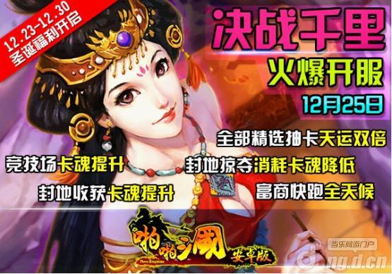 一年一度的圣诞驾到,你是否还在因为圣诞无聊而闷闷不乐?是否还在因为圣诞聚会人多嘈杂、上菜拖沓、排长龙队而心生厌烦?2013年度最好玩的霸气战争手游《啪啪三国》在圣诞期间特别推出全新活动,25日当天11:00更是开启新服“决战千里”,满足你在圣诞夜的所有需求,快来打发你的圣诞闲暇时光吧!