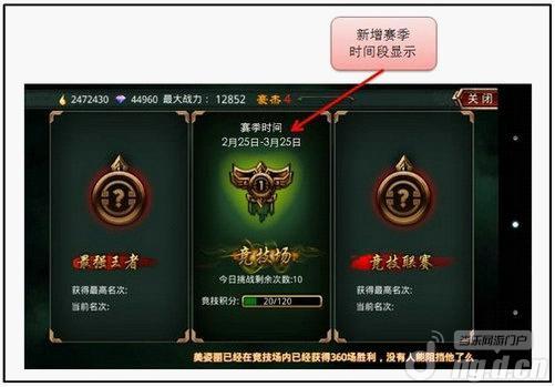 新版本竞技场将重新定义的赛季制, 2月28日前为第一赛季。作为第一赛季的奖励,系统将给符合条件的竞技场王者发放独特的金卡。作为奖励,刘禅、孙亮、于吉、卞夫人四张新金卡拥有特殊的双目标技能,比如孙亮的技能会在增强我方的同时削弱敌方。这将必然再次改变现有的阵容格局。